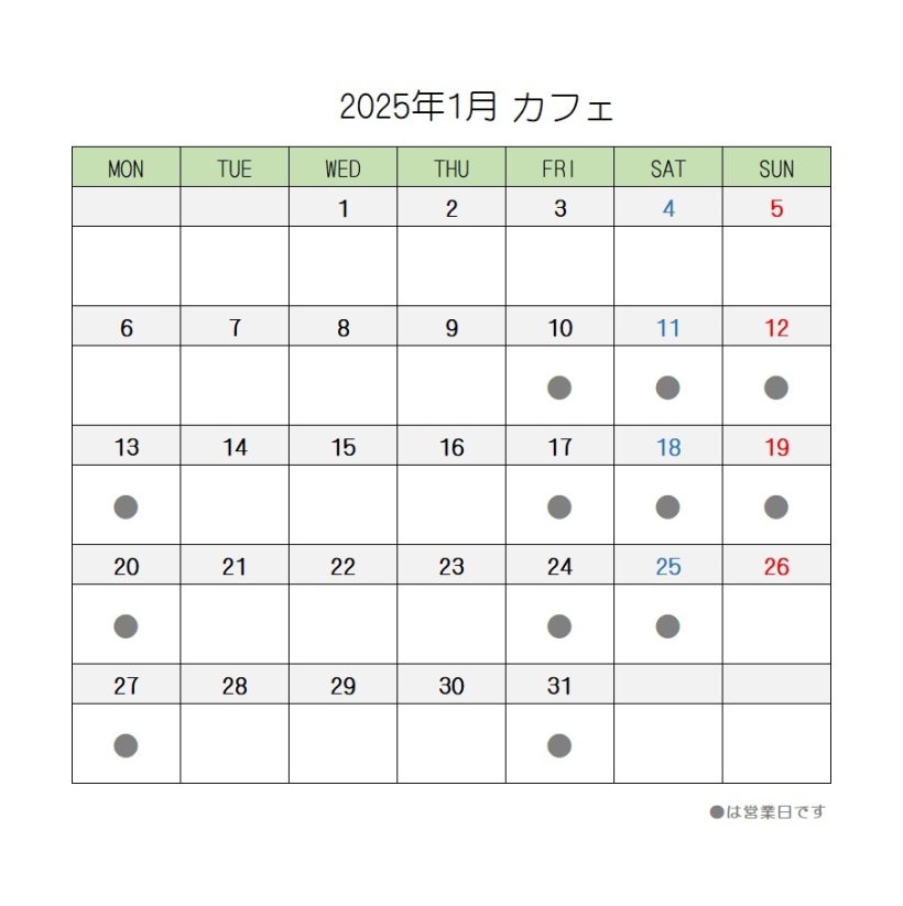 定休日 火・水・木曜日 第4日曜日1/26