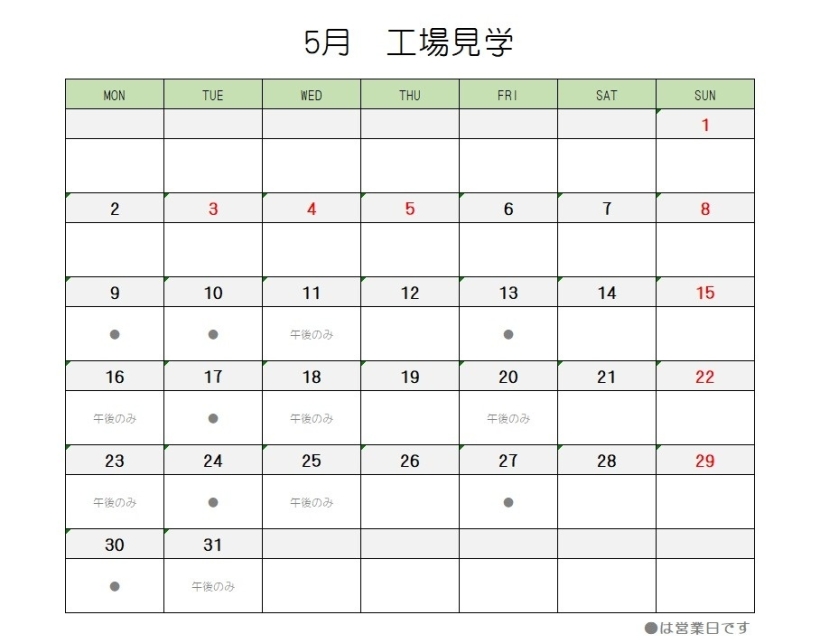 5月の営業スケジュール【直売店・茶房AOI・工場見学】