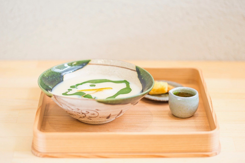 麹のほのかな甘い香りとオレンジピールが白あんベースの白しるこに上品なアクセントをつけます。濃厚抹茶ソースをたっぷりとかけてお召し上がりください。 *ほうじ茶付