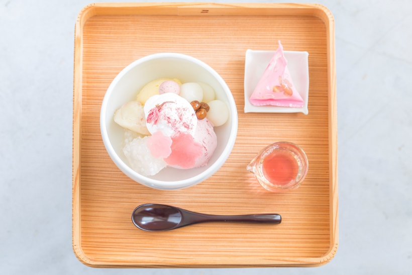 苺とバニラ、2種類のアイスクリーム。道明寺羹や桜あんの他に白玉、みつ豆などの和素材をふんだんに使った桜パフェは春だけのお楽しみです。 *桜の塩漬けと桜を型どった氷室(寒天菓子)が目印 *桜の香りがお口いっぱいに広がる桜シロップ *季節により内容は変動します